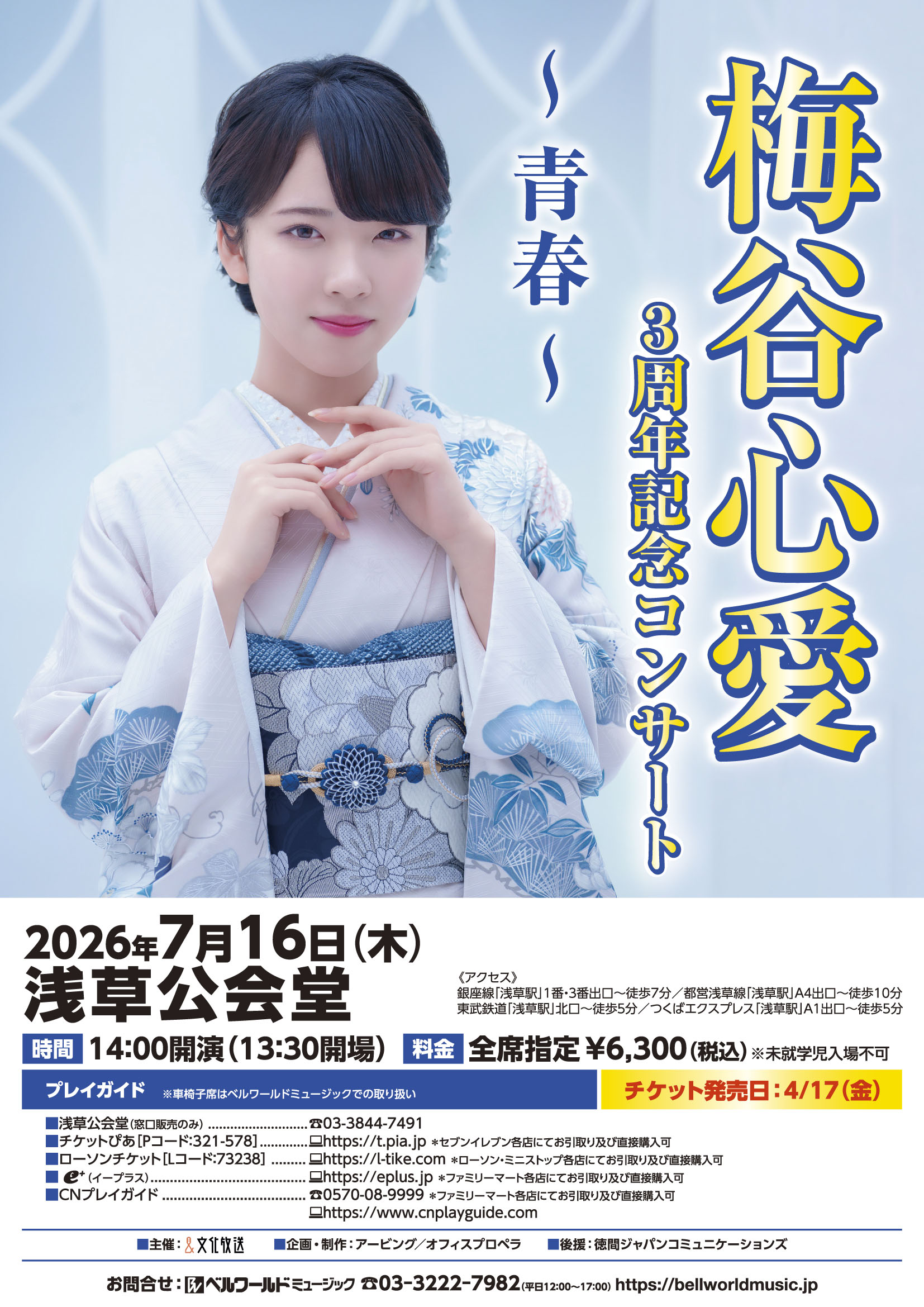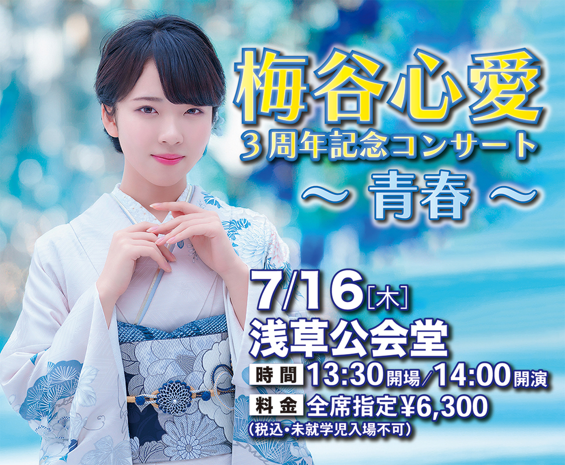 梅谷心愛。デビュー3周年を記念したスペシャルステージが、浅草公会堂で開催決定!若さ溢れる感性と確かな歌唱力。3年間の歩みと成長の全てを込めてお贈りする節目のコンサート!